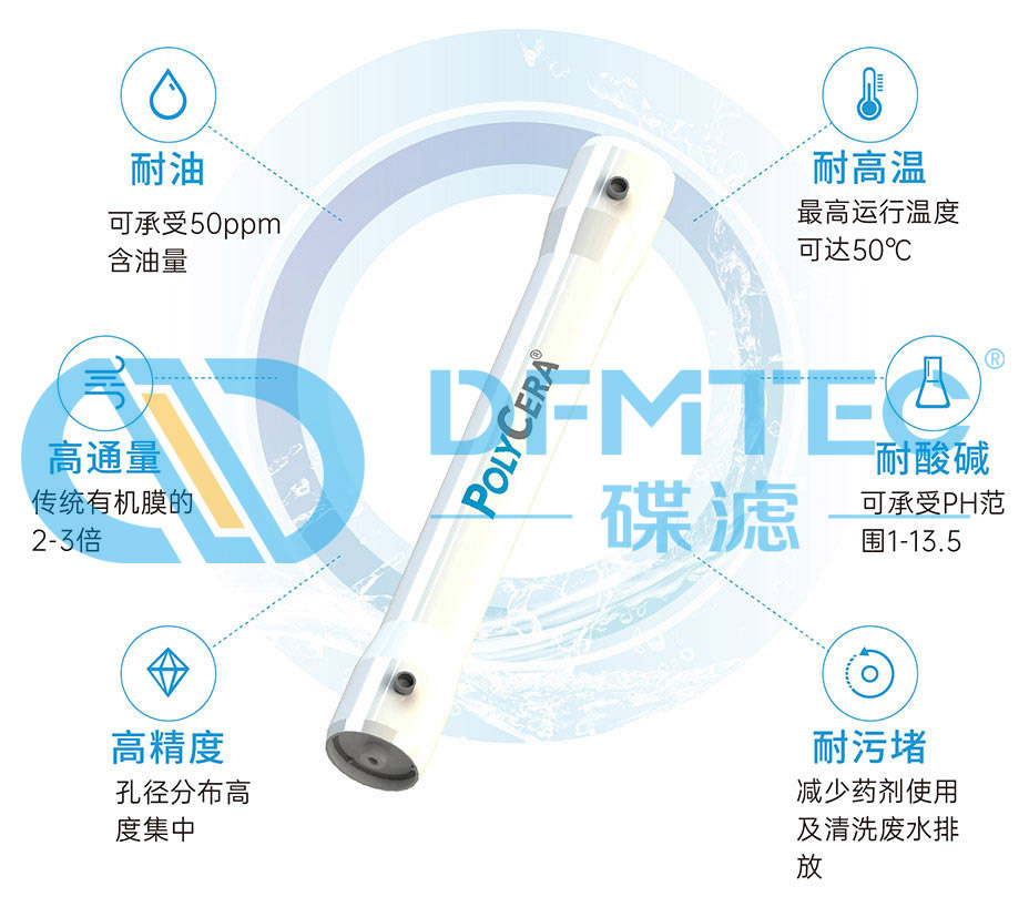PolyCera膜不僅擁有無機(jī)陶瓷膜的性能,同時(shí)具備有機(jī) 膜的精度高、成本低等優(yōu)勢(shì)。還有耐油、耐高溫、耐化學(xué) 性能,以及高通量、可反洗恢復(fù)等特點(diǎn)。 碟濾公司于2020年引進(jìn)PolyCera膜,并將之作為CT產(chǎn)品 系列主打—CTUF膜進(jìn)行實(shí)例應(yīng)用。
