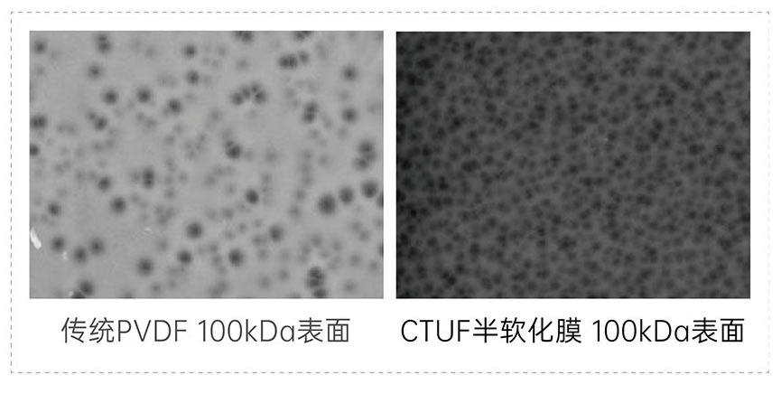 與傳統(tǒng)高分子膜相比,CTUF膜具有高成孔率,這意味著相同孔徑膜產(chǎn)水通量比傳統(tǒng)高分子膜高2-3倍。