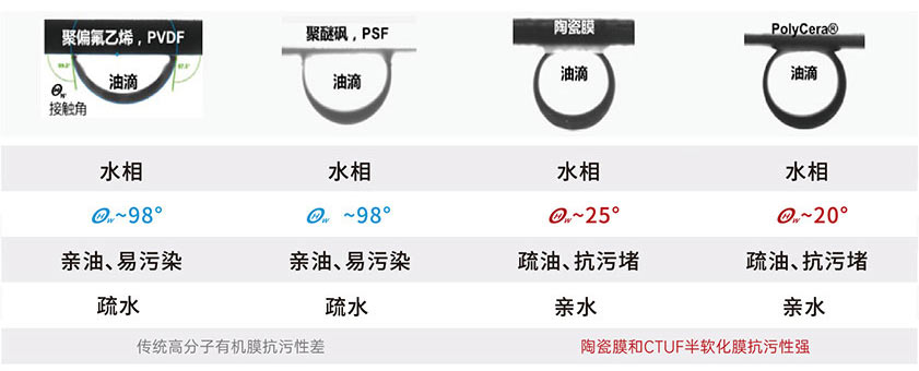耐污染、疏油親水的特性使CTUF膜可提供與陶瓷膜相當(dāng)?shù)某栌陀H水表面,耐污染、極易清洗的特性(參見實(shí)驗(yàn)效果對(duì)比圖)