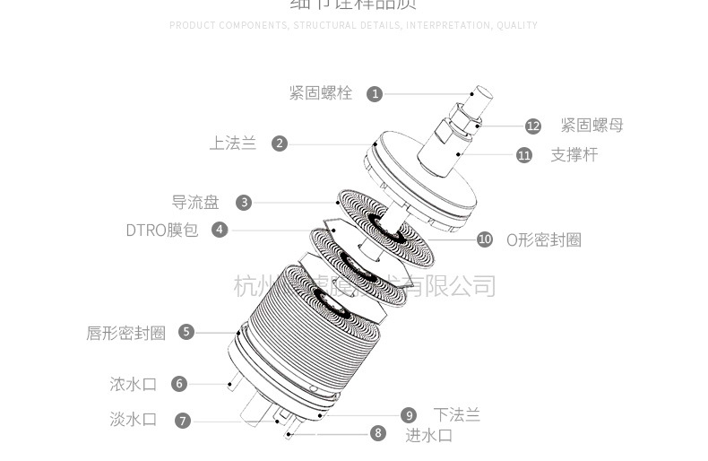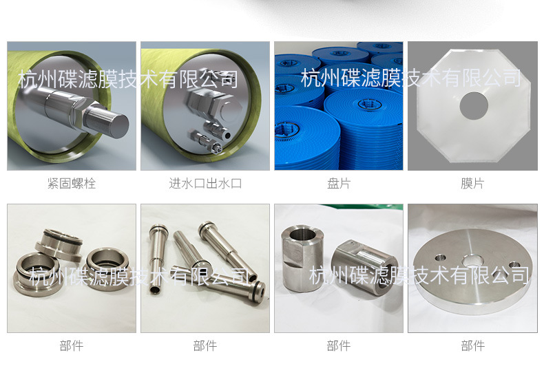 碟管式膜組件主要由RO膜片、導(dǎo)流盤、中心拉桿、外殼、兩端法蘭各種密封件及聯(lián)接螺栓等部件組成。把過濾膜片和導(dǎo)流盤疊放在一起,用中心拉桿和端蓋法蘭進(jìn)行固定,然后置入耐壓外殼中,就形成一個(gè)碟管式膜組件。