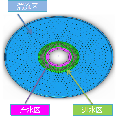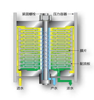 需要處理的污水,我們稱之為:原水,原水經(jīng)過設(shè)備上的高壓泵打入DTRO膜組件的進水接口,到達膜組件的頂部,經(jīng)過導流盤上的凸點,形成湍流,在導流盤的濃水孔隙中流入到與膜片接觸的那一面,經(jīng)過高壓,將原水與污染物進行分離,過濾后的凈水通過導流盤中心的凈水口經(jīng)過產(chǎn)水口排出,按設(shè)計要求達標排放或者進入下一級DTRO膜組件再次過過濾。被分離開的污染物經(jīng)過濃水孔隙進入下一張膜片過濾,以此類推。