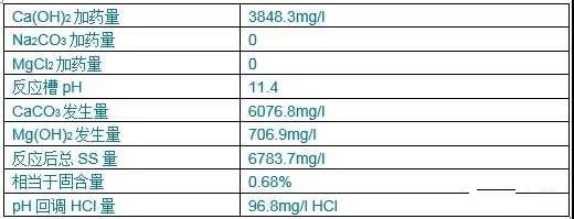 由于廢水含有極高堿度的特點(diǎn),使得滲濾液的軟化化學(xué)反應(yīng)可以采用相對(duì)廉價(jià)的氫氧化鈣作為堿劑,而無需擔(dān)心因氫氧化鈣帶入的鈣離子需要額外添加較昂貴的碳酸鈉?;谏鲜鏊|(zhì)的加藥類型和加藥量如下表所示(基于當(dāng)量):